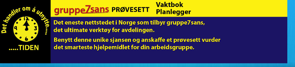Dette prøvesettet er et tilbud slik at du kan prøve en Gruppe 7.sans i praksis og få oppleve de unike egenskapene og kontroll over de daglige oppgaver verktøyet gir. Trenger du ikke turnus funksjonene som Vaktboka tilbyr, så er Planlegger det rette verktøyet for deg.